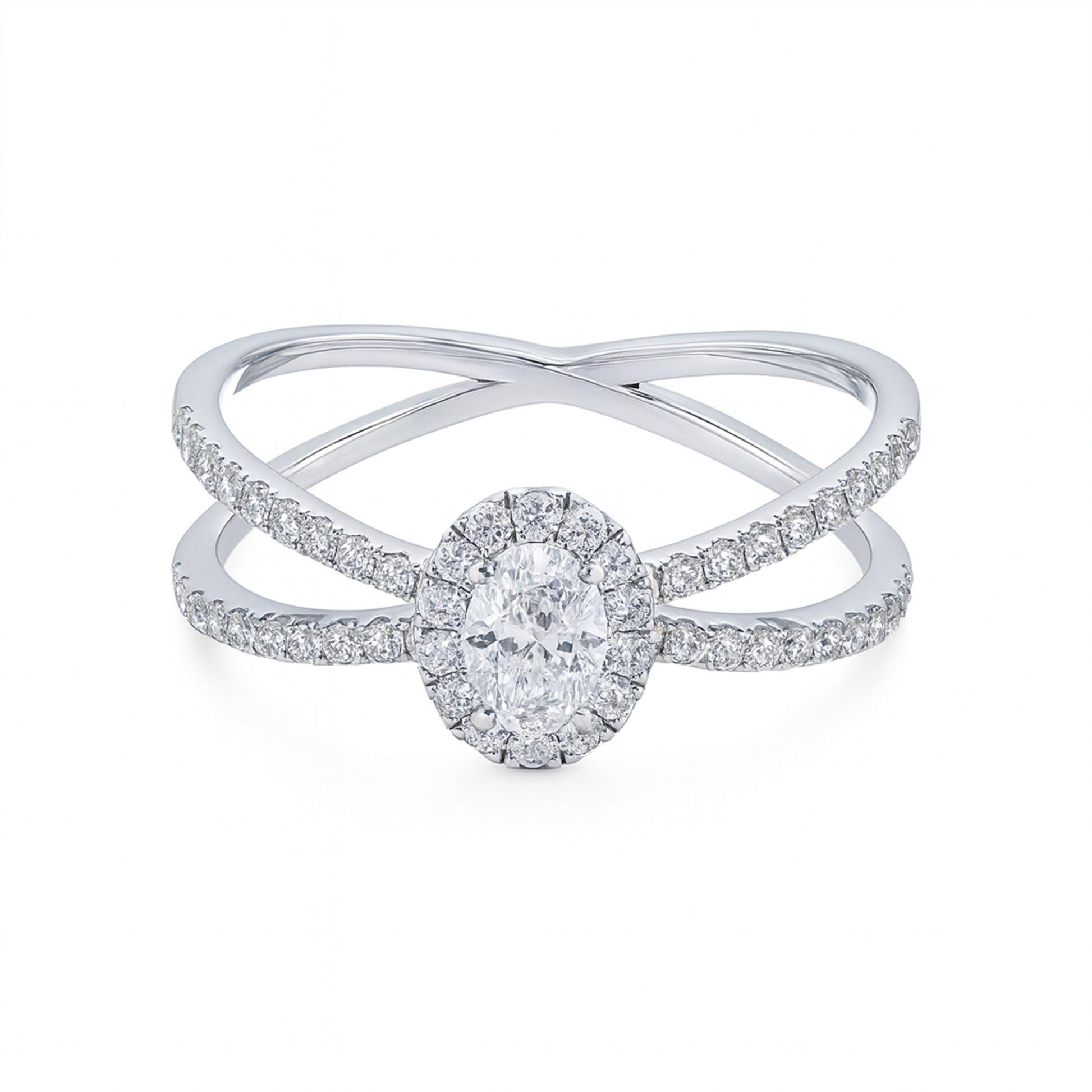 Modern Double Band Design: Elegant double-band style with pave-set diamonds and an oval halo centerpiece for maximum brilliance.