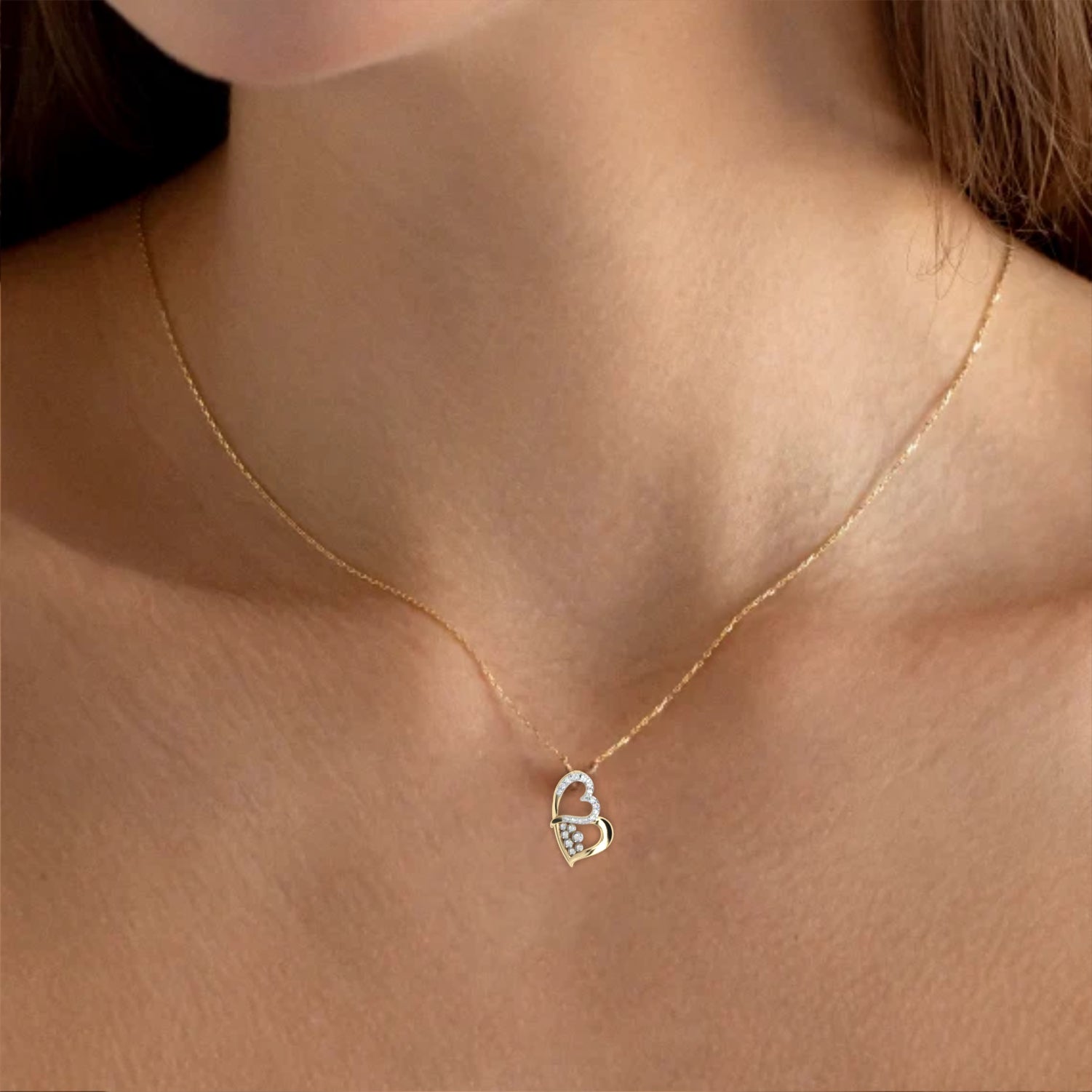 Experience elegance and sustainability with this Modern Double Heart Design Lab Grown Diamond Pendant. Made with a stunning 0.36 diamond and set in a 3.98 gold setting, this pendant makes a bold and eco-conscious statement. No chain included.